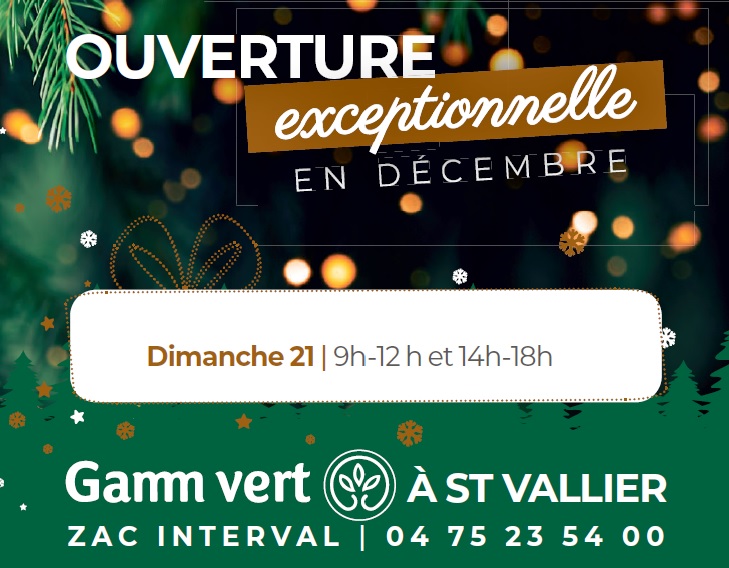 Les 24 et 31 décembre, votre magasin Gamm Vert de St Vallier fermera ses portes à 17h.